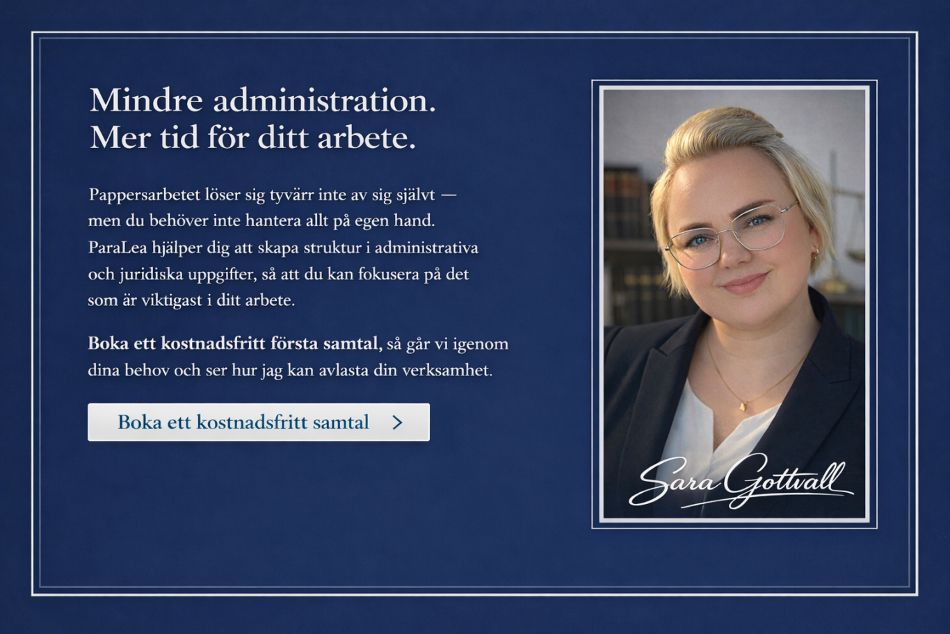 ParaLea stöttar företag och verksamheter med kvalificerad administrativ och juridisk support. Genom struktur, noggrannhet och effektiva arbetssätt bidrar det till tryggare processer och mer tid för det som är viktigast, er kärnverksamhet.